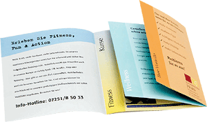 Das offene Format des Folders beträgt 60 x 14 cm. Genügend Raum also, um Ihren Club in bestem Licht zu präsentieren. Mit Ihren Fitness-, Kurs- und Wellnessangeboten
