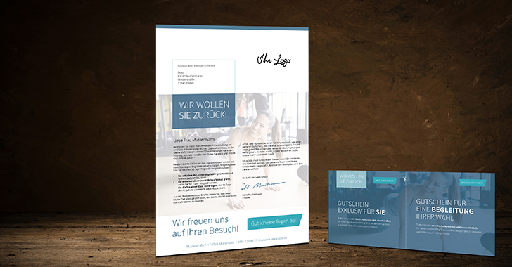 Die Bestandteile dieser Come-Back-Kampagne sind: ein Brief mit persönlicher Anrede sowie zwei beidseitig personalisierte Gutscheine, die dem Brief beigelegt werden. Alles zusammen wiegt unter 20 g, sodass man die Briefe kostengünstig als Dialogpost für 0,28 € / Brief versenden kann.