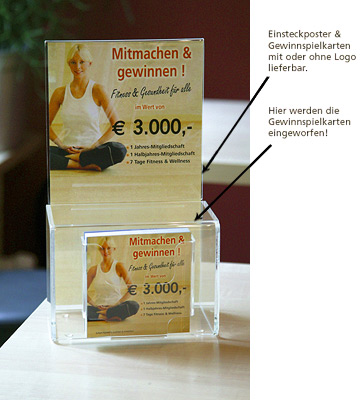 Zur Ausstattung einer Lead-Box gehören Einsteckposter und Gewinnspielkarten, die mit Ihrem Logo individualisiert werden können.