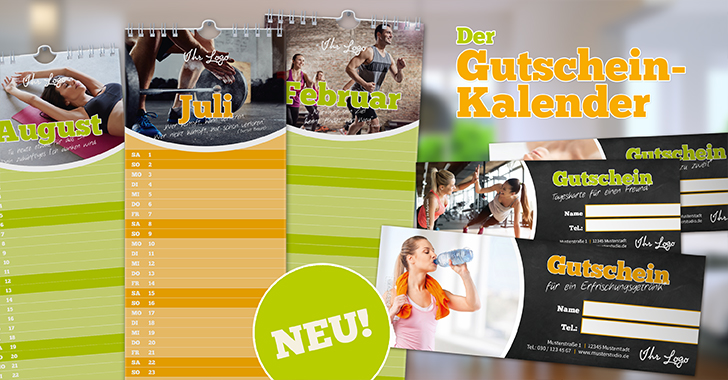 Verschenken Sie zum Jahresstart unseren Gutschein-Kalender - dann sind Sie ein ganzes Jahr bei Ihren Mitgliedern zuhause präsent! Jeden Monat gibt es im unteren Bereich der Kalenderblätter je einen Gutschein zum Abschneiden. Wir empfehlen Gutscheine zur Steigerung der Mitglieder-Zufriedenheit sowie Tages- und Wohlfühl-Gutscheine für Freunde Ihrer Mitglieder.
