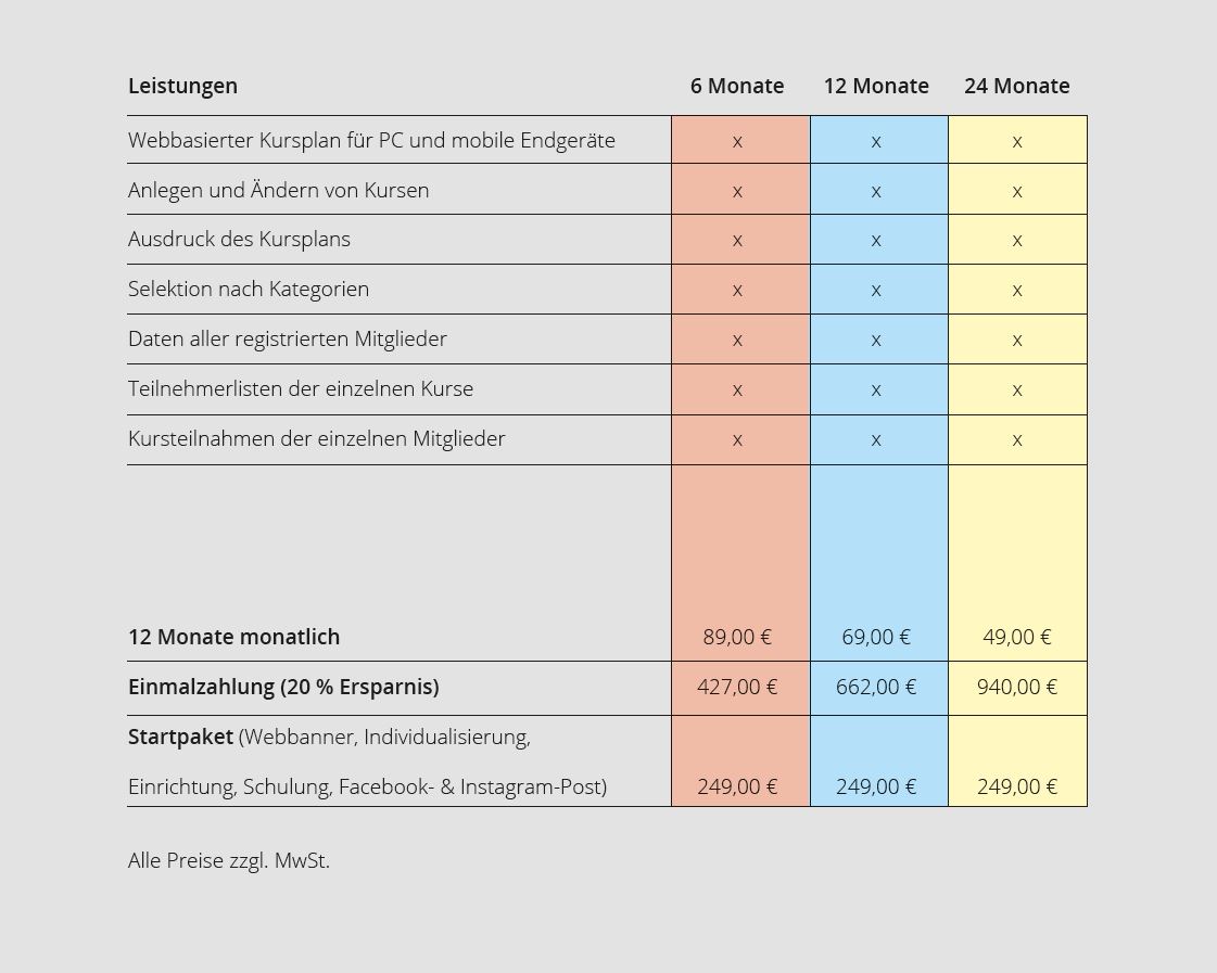 • Der Kursplan kann jederzeit von Ihnen geändert werden und steht dann sofort online in der neuen Version zur Verfügung.