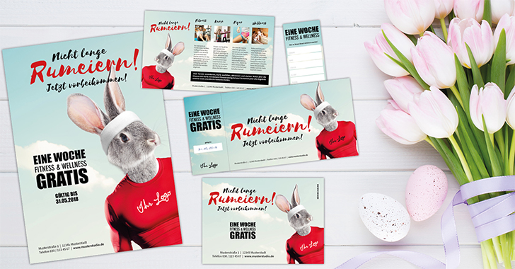 Die Kampagne kombiniert den coolen Osterhasen mit einer einprägsamen und lustigen Headline. Damit laden Sie die Empfänger zu einer Testwoche (individuell anpassbar) in Ihren Club ein.