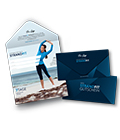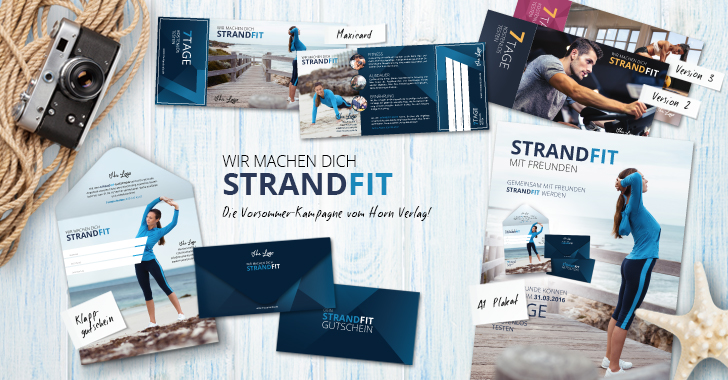 Die STRANDFIT-Kampagne ist in zwei Ausführungen erhältlich: als Klappgutschein (in 3 Motiven) und als Scheckkarte mit Hülle.