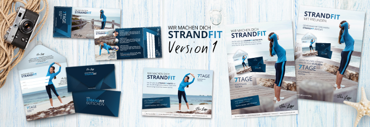 Dieser Klappgutschein „Strandmotiv“ sowie die dazugehörigen internen/externen Werbemittel zeigen auf der Innenseite eine junge Dame am Strand. Die Außenseite ist in einem eleganten Dunkelblau gedruckt. Ein ästhetisches Motiv, welches das Thema „Wir machen dich strandfit“ schön visualisiert und vor allem Damen anspricht.